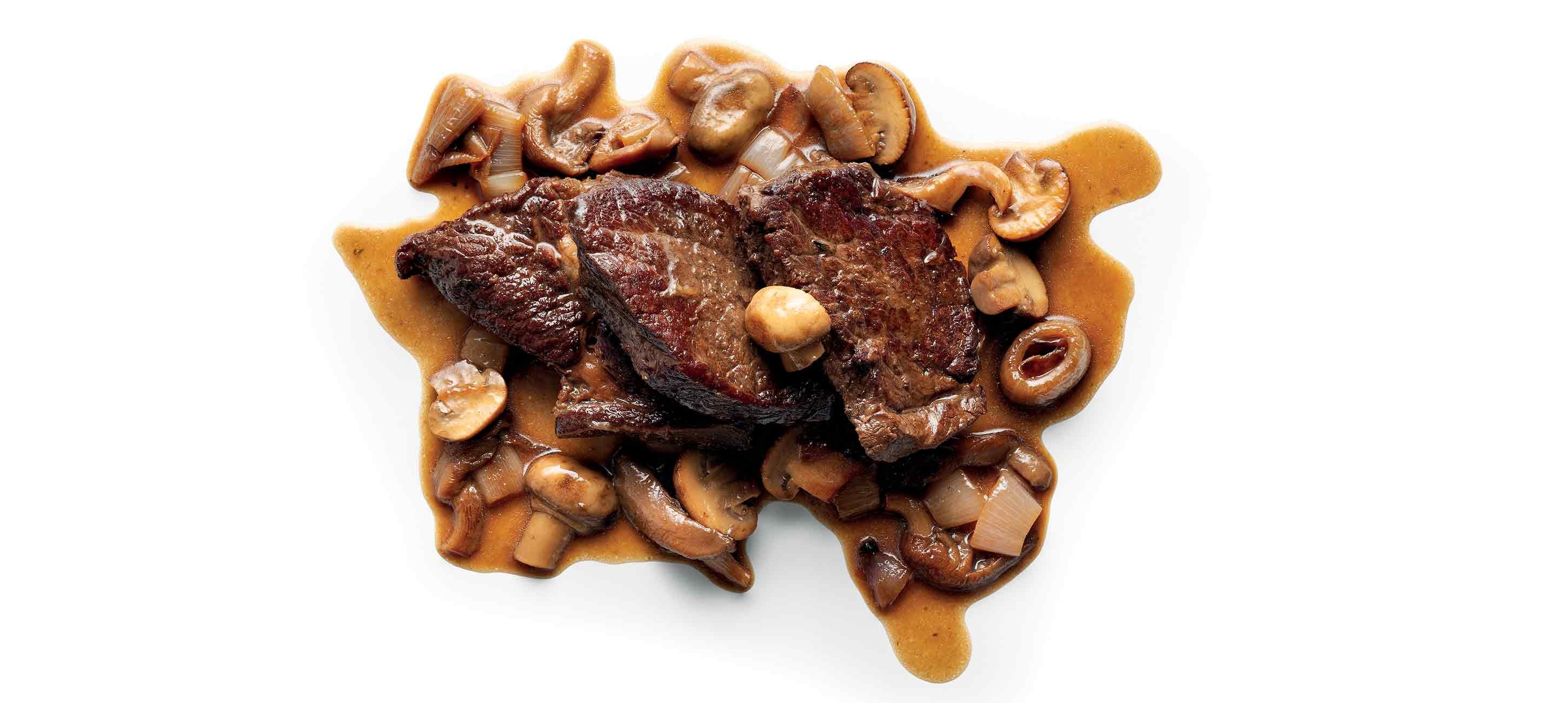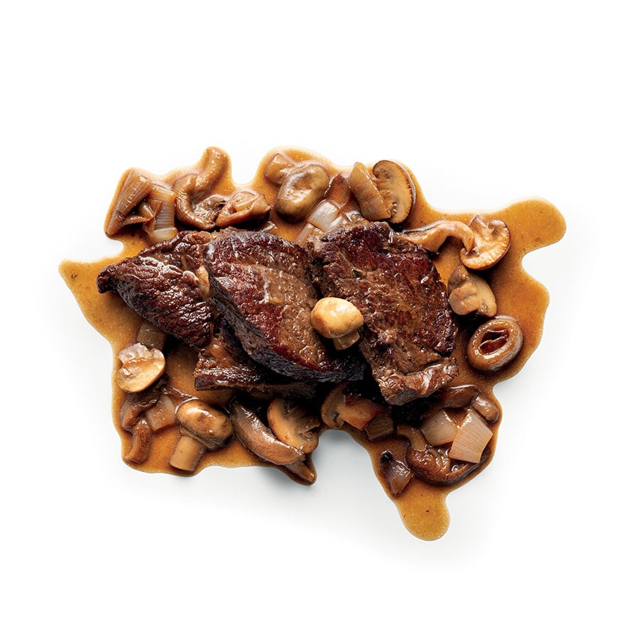 - 6Do kastrolu s orestovanými houbami vložíme měkké maso. Omáčku, ve které se maso dusilo, necháme 1 minutu provařit, dle chuti ji osolíme a propasírujeme přes cedník k masu a houbám. Necháme 1 minutu provařit.