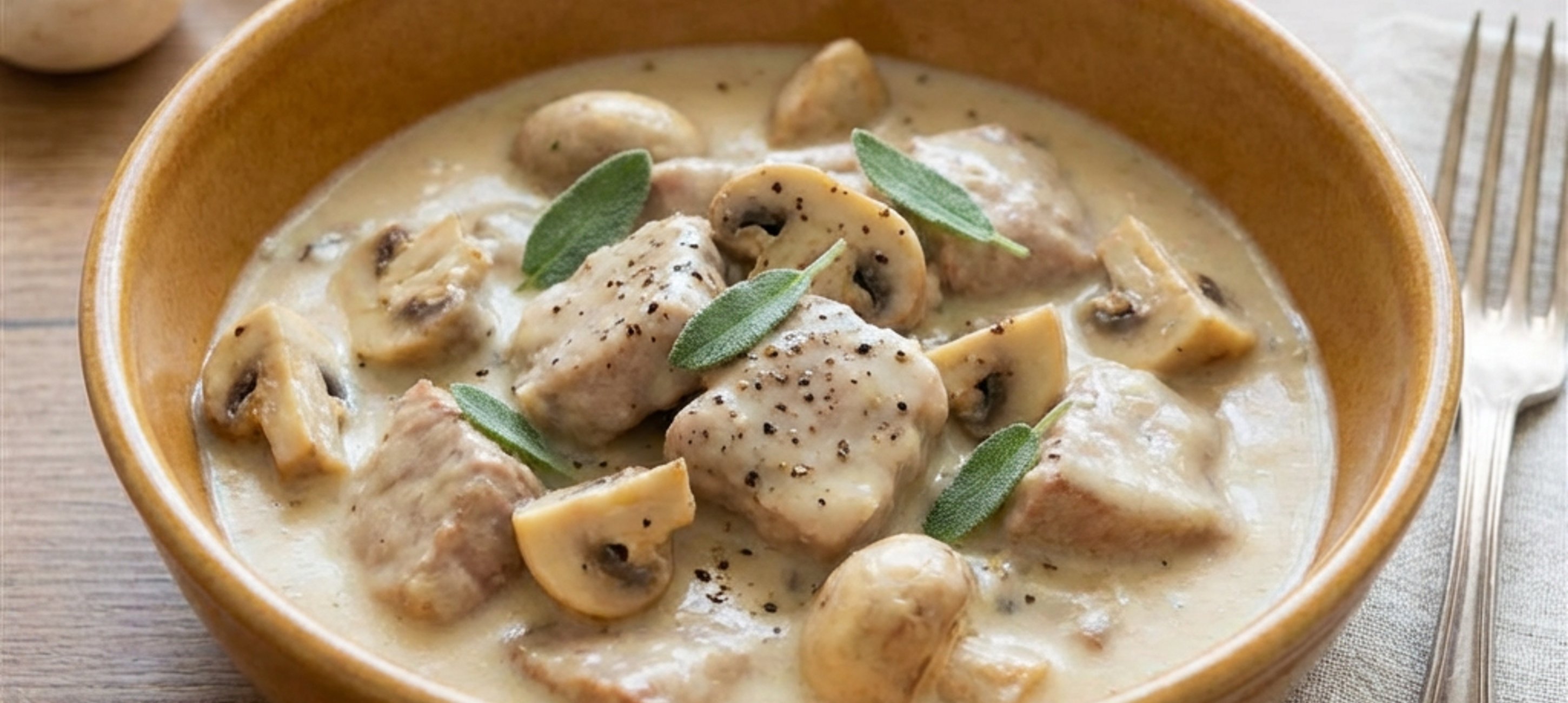 - 5Měkké maso vyndáme z kastrolu a dáme stranou. Omáčku přecedíme do čistého rendlíku, přidáme smetanu, promícháme a rozmixujeme tyčovým mixérem. Přivedeme k varu, vrátíme maso zpět a vaříme další 3 minuty.