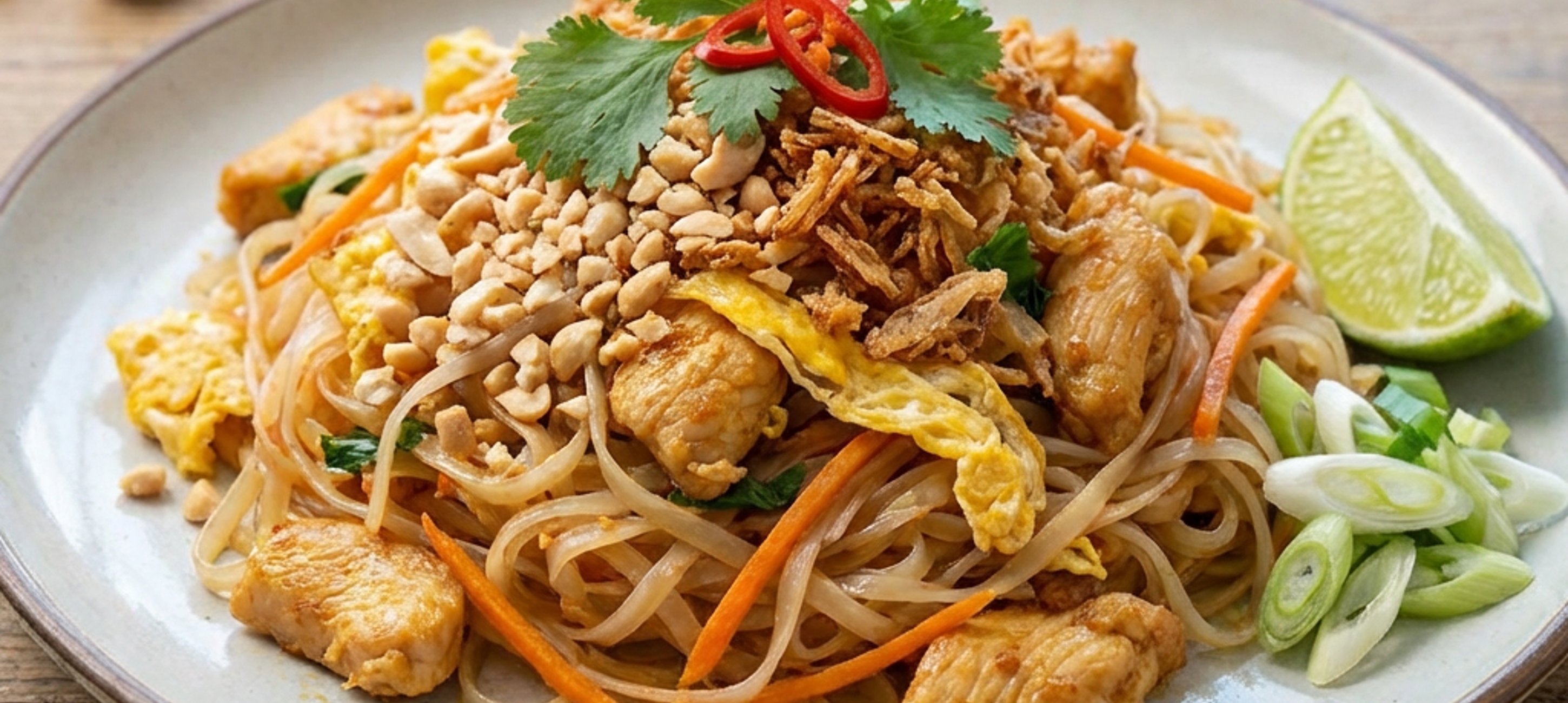 - 4Přimícháme předem namočené nudle a poté přidáme všechna ochucovadla najednou (cukr, sójová omáčka, rybí omáčka, tamarindová pasta) a jako poslední vhodíme pórek a jarní cibulku. Hotové nudle pad thai ozdobíme arašídy, koriandrem, chilli a smaženou cibulkou.
