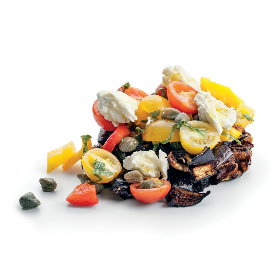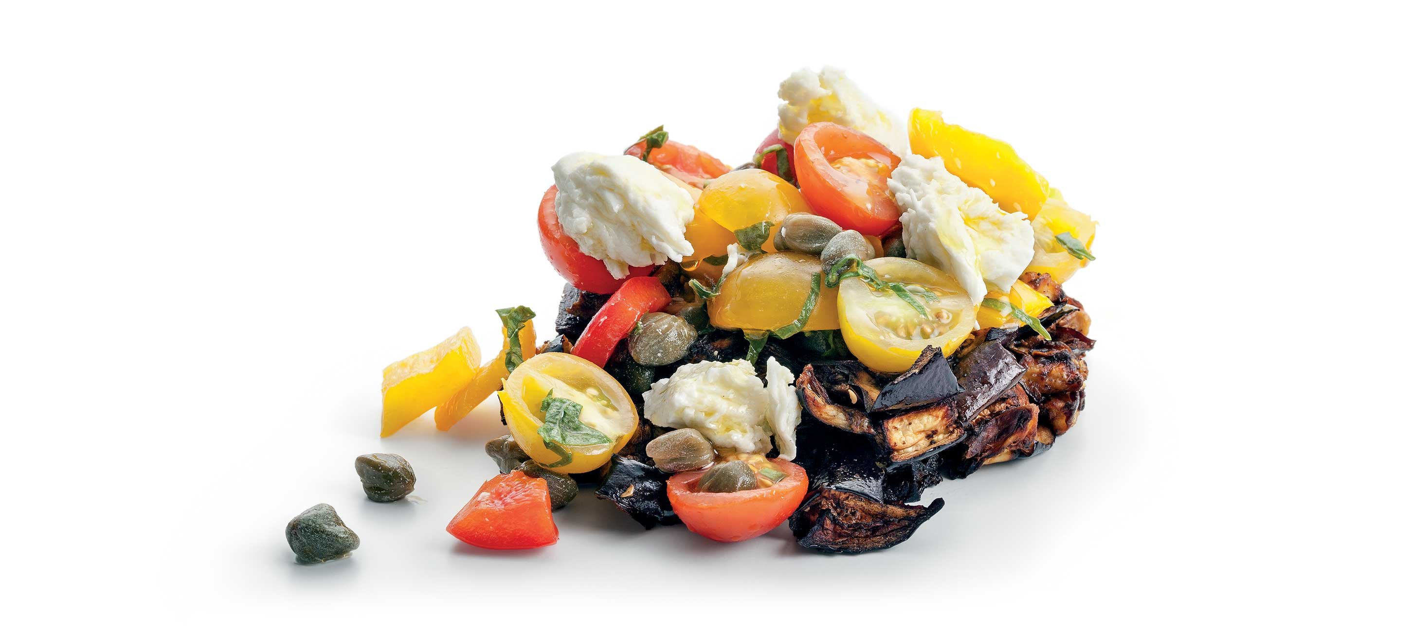 - 4Vychladlý lilek rozdělíme na jednotlivé talíře. Na lilek přidáme promíchanou zeleninu a natrhanou mozzarellu.