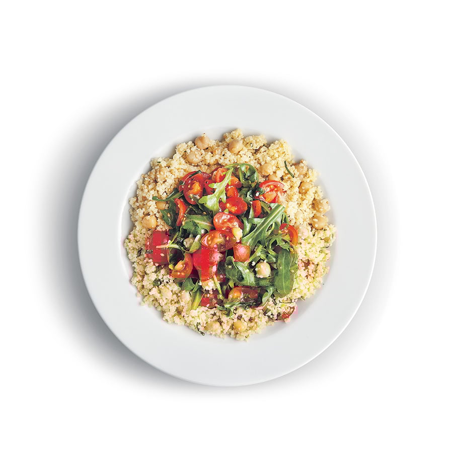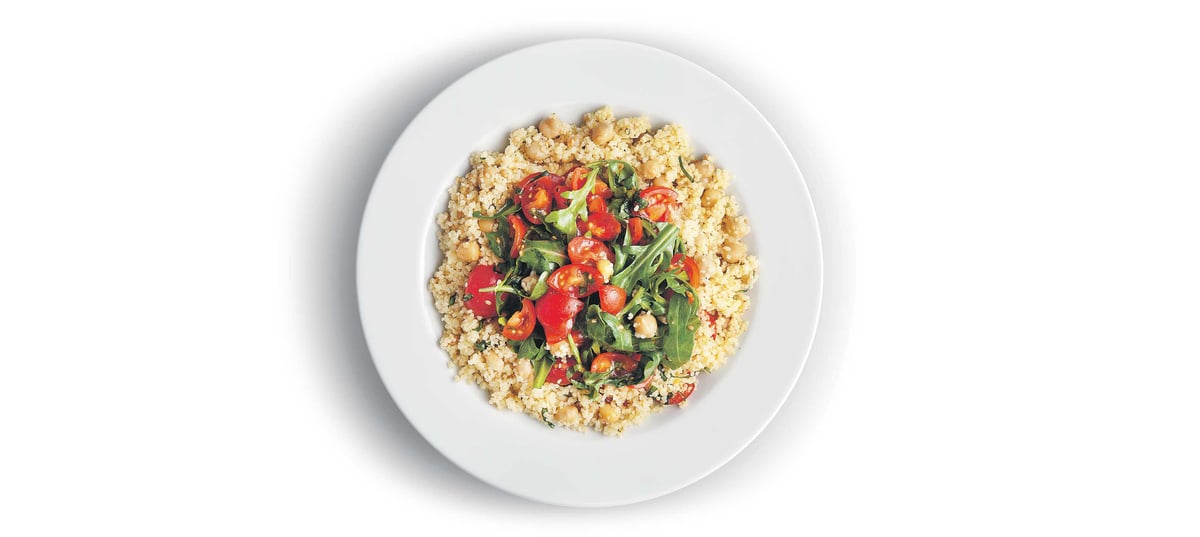 - 1V rendlíku rozehřejeme 2 lžíce oleje, přidáme kuskus a 1 minutu ho za stálého míchání restujeme na středním ohni. Přilijeme 240 ml vody a přivedeme ji k varu. Stáhneme z ohně, přiklopíme poklicí a necháme 5–7 minut odstát, než se veškerá voda vstřebá. Hotový kuskus načechráme vidličkou, aby byl sypký, a necháme ho vychladnout.