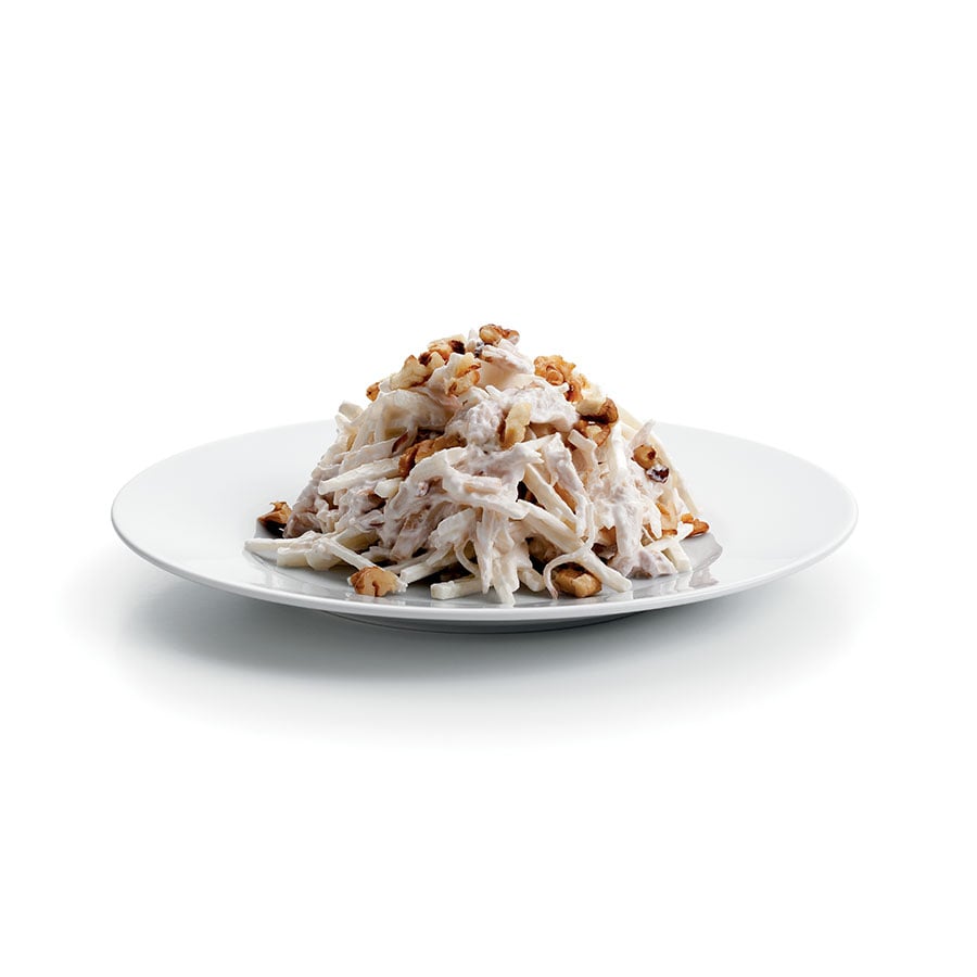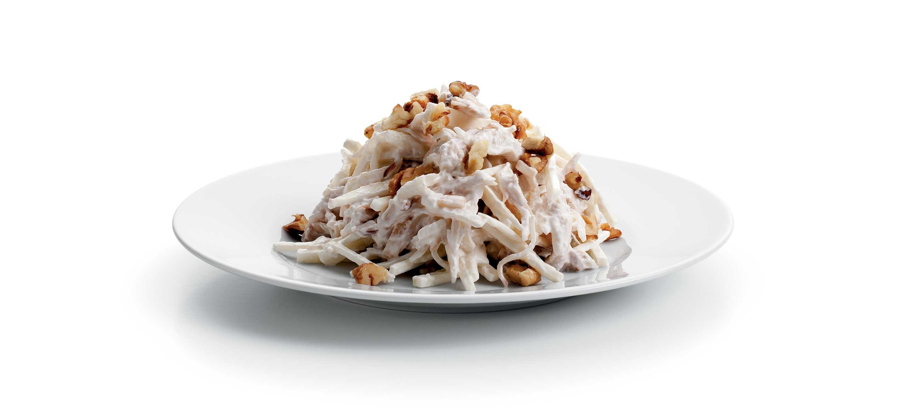 - 4Do mísy dáme okapaný celer, nakrájené ořechy, jablka, kuřecí maso a přidáme zakysanou smetanu, citronovou šťávu a sůl. Promícháme a dáme do lednice vychladit.