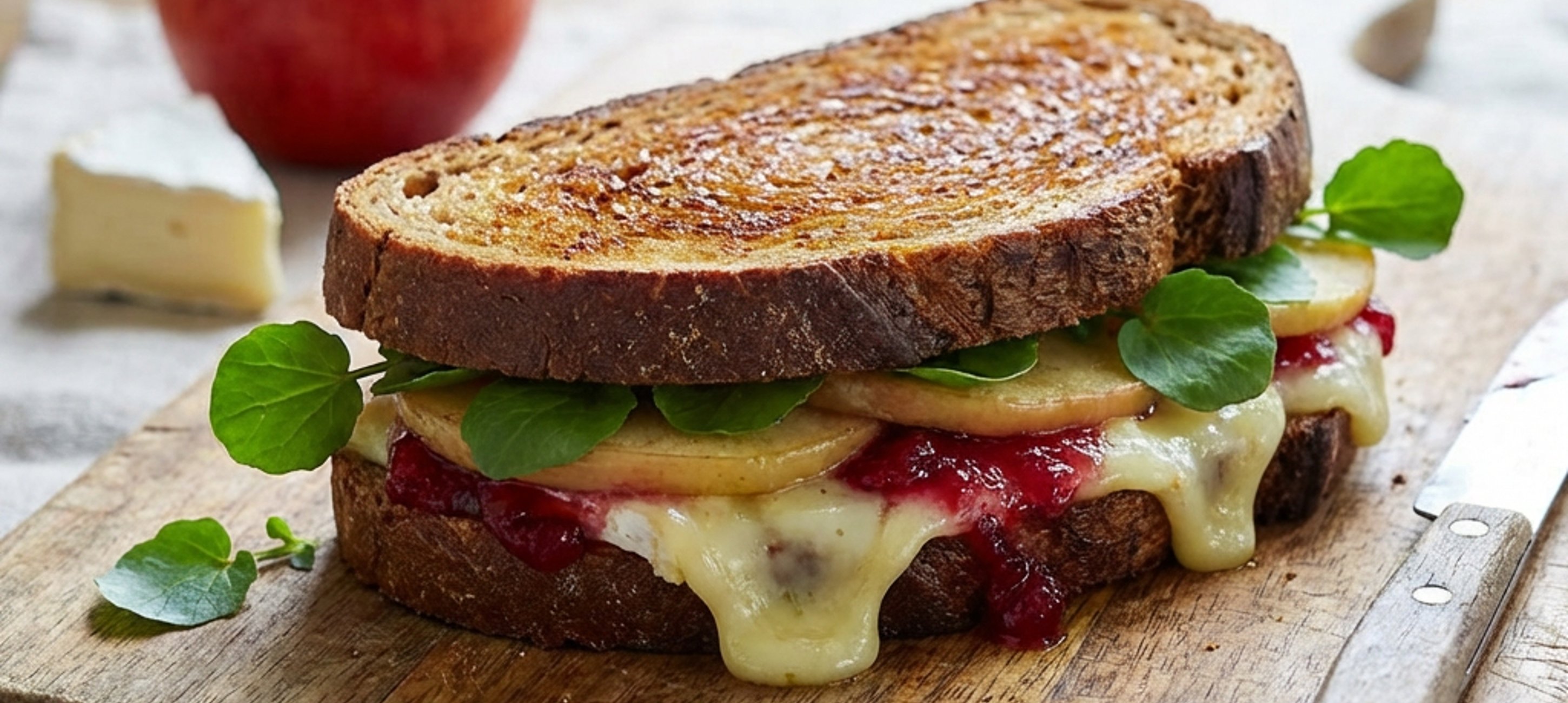 - 3Rozehřejeme pánev na mírném ohni a položíme na ni toustový chleba namazanou stranou dolů. Na chleba rozložíme část plátků sýra, na ně položíme část plátků jablek, posypeme částí řeřichy a pokryjeme částí brusinkové marmelády. Přiklopíme plátkem chleba namazanou stranou nahoru.