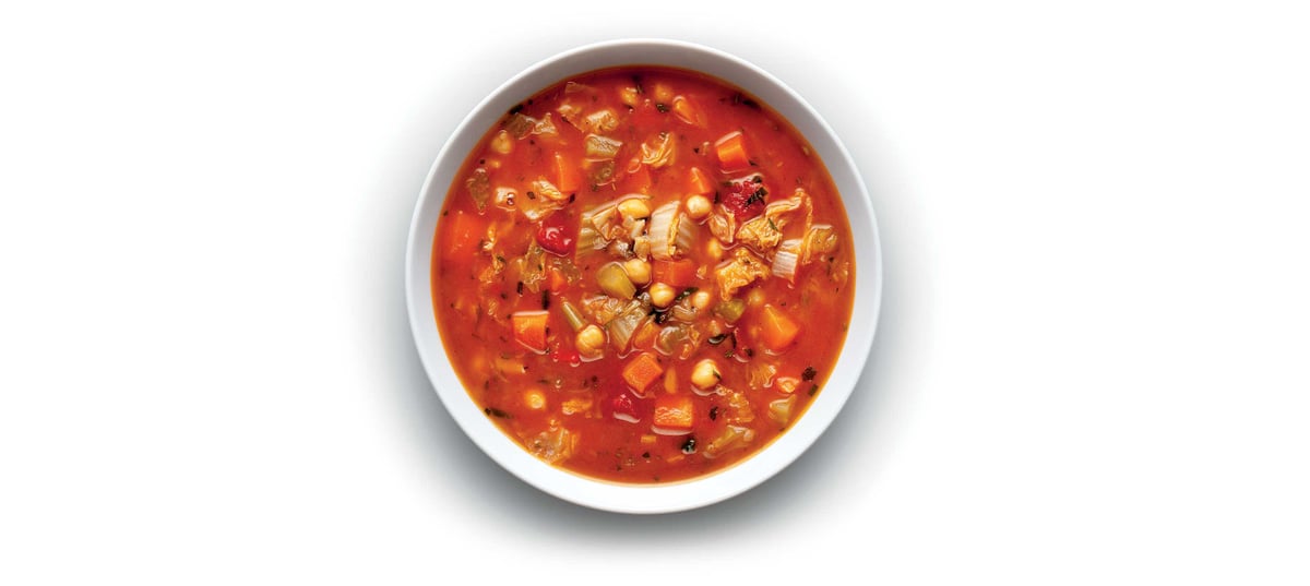 V kastrolu na středním ohni rozehřejeme olivový olej, přidáme cibule a česnek a necháme je zesklovatět. Přidáme cizrnu a restujeme 30 vteřin. Přidáme mrkev a řapíkatý celer, 1 lžičku soli, promícháme a restujeme za stálého míchání 30 vteřin. Přidáme rozmarýn, kajenský pepř a konzervovaná rajčata, promícháme a přilijeme vývar. Přivedeme k varu, stáhneme oheň na čtvrtinu a vaříme, než bude cizrna měkká, přibližně 40 minut.