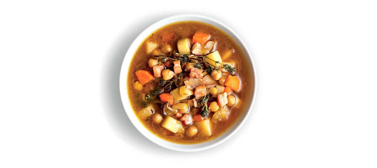 - 4Přidáme nakrájenou slaninu a za občasného míchání restujeme 1 minutu. Přidáme cizrnu a restujeme další 1 minutu. Přidáme namočené houby i s vodou, ve které se máčely, a přilijeme 600 ml vody. Přivedeme k varu a vaříme 25 minut nebo než je zelenina měkká na skus. Dle chuti osolíme a opepříme.