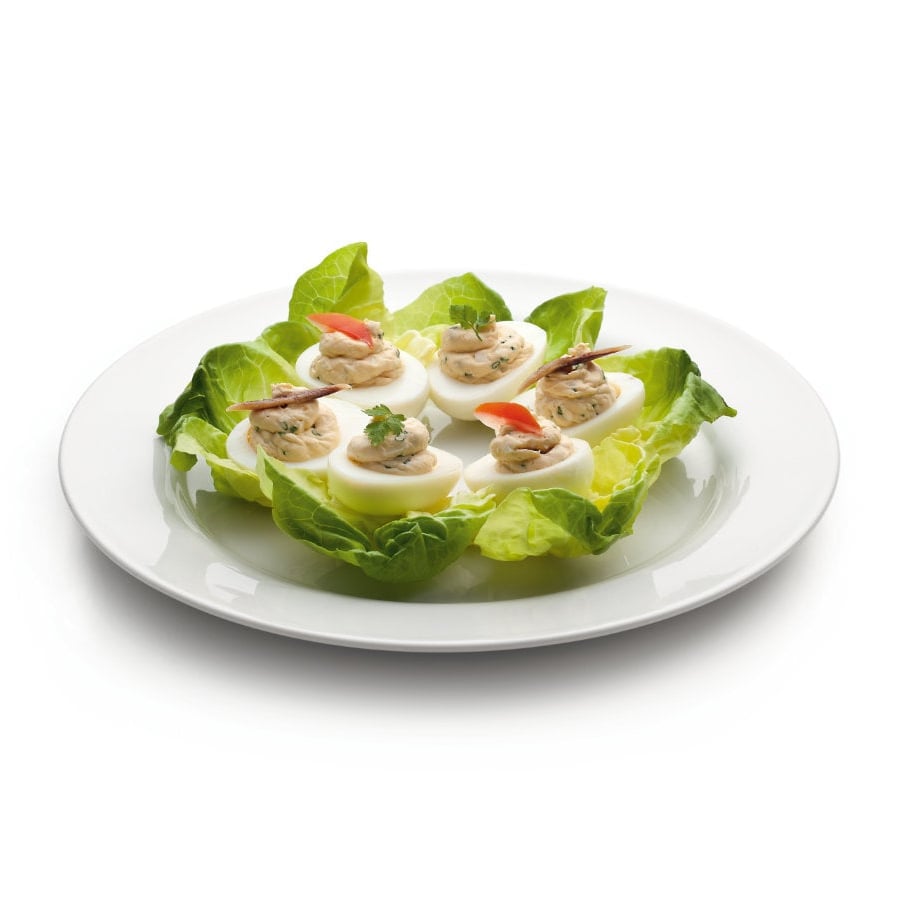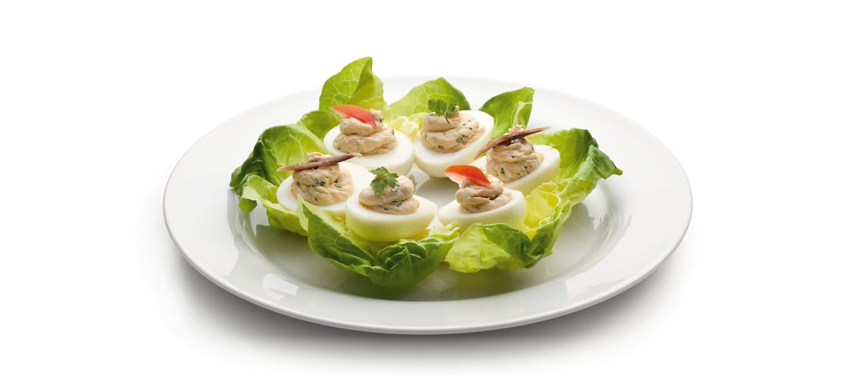 - 4Plněná vejce položíme na mísu vyloženou salátovými listy. Ozdobíme ančovičkou a kouskem rajčete.