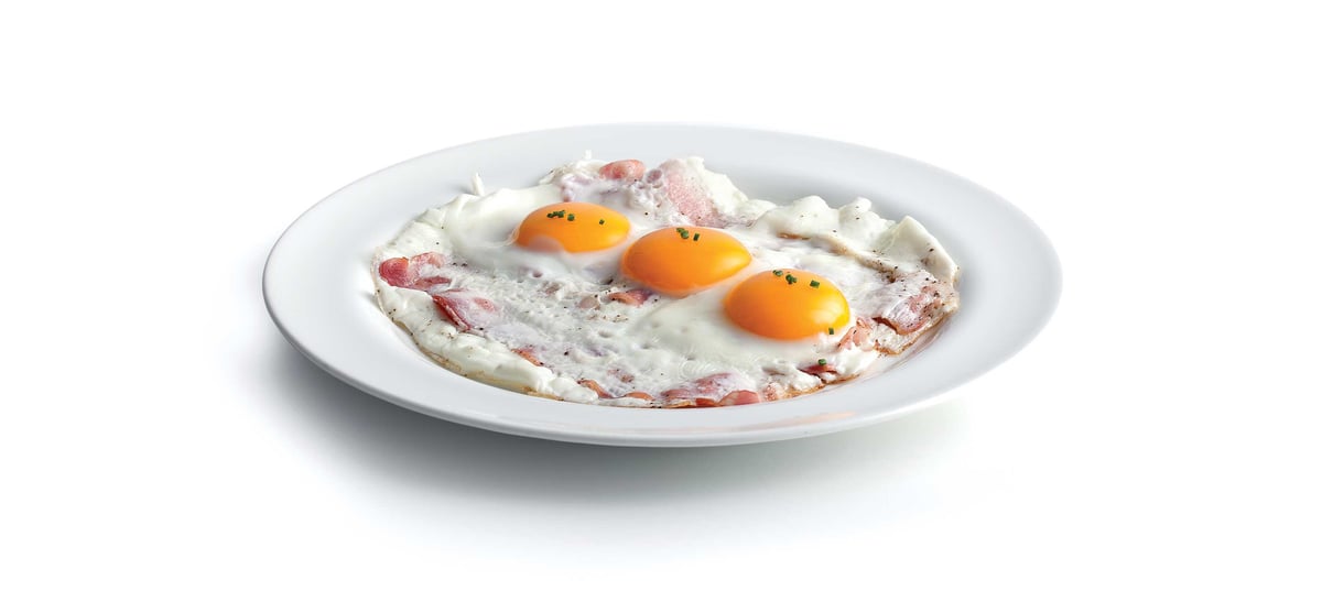 - 3Stáhneme oheň na třetinu, vejce vylijeme na slaninu a pečeme dalších 5 minut nebo dokud bílek neztuhne.