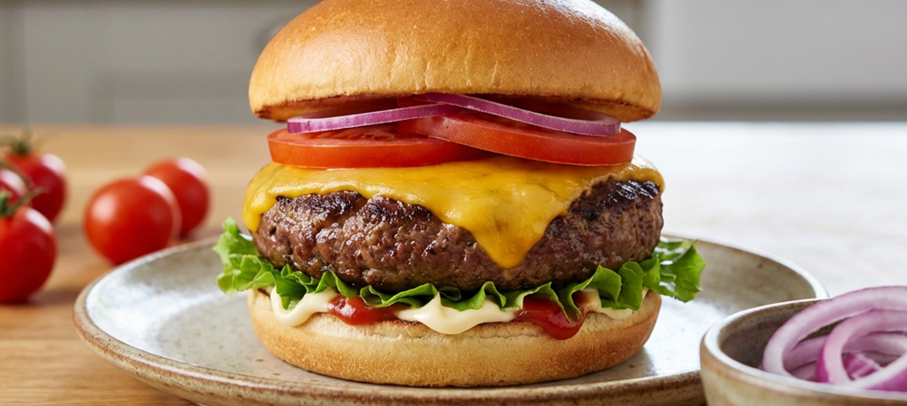 - 3Housku poté pomažte majonézou, kečupem nebo kombinací obojího, přidejte opečené maso na burger a další suroviny dle chuti, jako je plátky rajčete, cibule a salátu. Přiklopte houskou, případně rozkrojte a ihned podávejte.