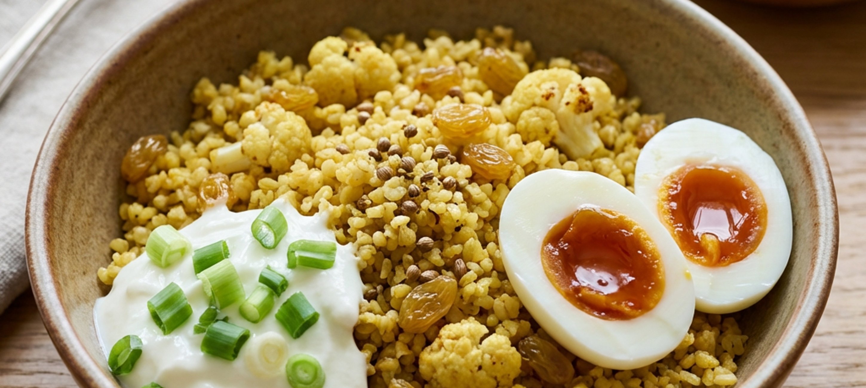- 2Bulgur, květák, sůl, koriandr a rozinky nasypte do širokého kastrolu a promíchejte. Přidejte máslo,zalijte 350 ml studené vody, zakryjte poklicí a přiveďte k varu.