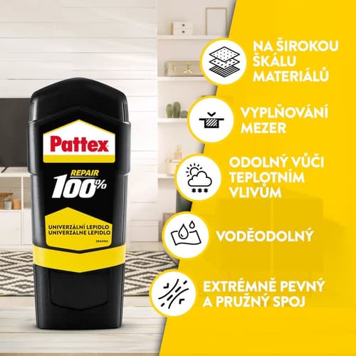 Univerzální lepidlo na bázi FLEXTEC® polymeru bez obsahu rozpouštědel a vody je ideální k lepení a drobným opravám namáhaných spojů. Díky své gelové konzistenci nestéká a nekape, proto je vhodný i k aplikacím na svislé povrchy. Pattex 100% je vhodný pro kutilské, modelářské a opravárenské práce v interiéru i exteriéru, pro tvorbu dekorativních předmětů s průhlednou povrchovou úpravou apod. Vhodný k lepení nebo povrchové úpravě savých i nesavých materiálů, jako jsou hliník, beton, ocel, nerezová ocel, obklady a dlažba, sklo, keramika, dřevo, korek, měď, mosaz, povrchově upravené materiály, skelným vláknem vyztužený polyester (GFP), kůže, plátno, papír, karton, tvrzené PVC, polykarbonát, pěnový polystyren, kámen, zinek, zrcadla.