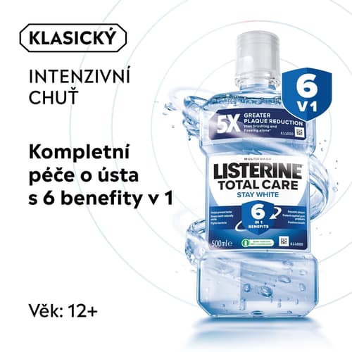 Listerine Total Care Stay White mouthwash helps keep teeth whiter and protects against tartar. Its clinically proven formula destroys harmful bacteria that cause gum disease and freshens breath for up to 24 hours.