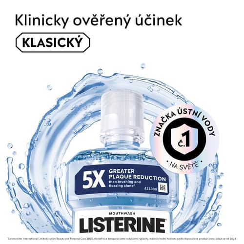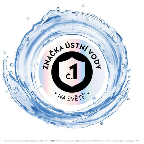 Aqua, Alcohol, Sorbitol, Poloxamer 407, Benzoic Acid, Zinc Chloride, Eucalyptol, Methyl Salicylate, Thymol, Sodium Benzoate, Sodium Fluoride, Menthol, Sucralose, Aroma, Sodium Saccharin, CI 42090. Obsahuje alkohol. Obsahuje fluorid sodný (220 ppm F-)