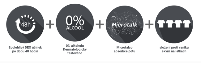 Díky své lamelární struktuře a chemickému složení se váže na tekutinu a pomáhá výrazně snížit pocit vlhkosti, který je obvykle spojen s potem. Microtalcum je navíc schopno uklidnit pokožku a pomoci ji chránit před podrážděním.
