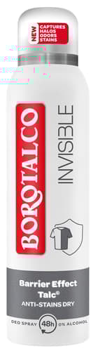 Deodorant Borotalco Invisible byl vyvinut speciálně za účelem redukce vzniku žlutých skvrn na světlých látkách a bílých stop na tmavých látkách. Díky svému složení s obsahem Microtalca, pohlcujícím pot, reguluje deodorant pocení a denně zajišťuje suchou pokožku.