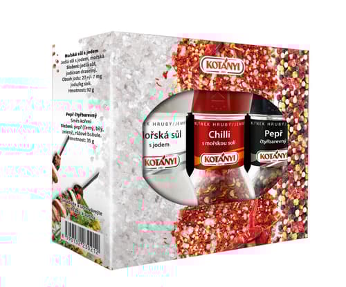 Balení obsahuje mlýnek čtyřbarevného pepře, mořské soli a chilli.