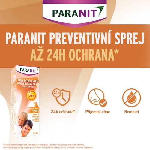Paranit Preventivní sprej proti vším poskytuje okamžitou a dlouhotrvající ochranu proti vším (24 hodin). Jeho jemné složení s obsahem IR3535 a výtažků z rostlin bylo klinicky ověřeno jako účinné k odpuzení vší a je vhodné pro každodenní použití. Snadné použití Bezoblachový Nemastí, usychá přirozeně Příjemná vůně Vhodné pro dospělé a děti od 2 let Při výskytu vší ve vašem okolí používejte Paranit Preventivní sprej proti vším každý den, aby se zabránilo nakažení, případně začněte přípravek používat okamžitě po dokončení odvšivení, aby se zabránilo opětovnému výskytu vší. Balení obsahuje 100 ml.