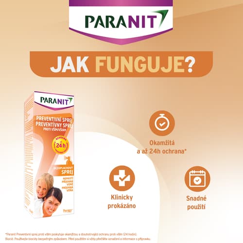 Dávkování: Jak používat Paranit Preventivní sprej? Dodržujte návod k použití. Ujistěte se, že nejsou přítomny vši. V případě potřeby nejprve použijte přípravek na odstranění vší. Přípravek odpuzuje pouze nové napadení. Po aplikaci tento přípravek odpuzuje vši až 24 hodin. Aplikujte každé ráno na umyté a ručníkem vysušené vlasy po úpravě obvyklým způsobem. Nastříkejte přípravek na vlasy v blízkosti vlasové pokožky (mezi 2-5 cm) na celé vlasy jako lak. Ujistěte se, že máte pokryté všechny vlasy, přičemž zvláštní pozornost věnujte oblasti kolem krku a za ušima. Ujistěte se, že pokožka hlavy a vlasy jsou dostatečně zvlhčené. Nechte vlasy přirozeně uschnout bez použití tepla. Nepoužívejte fén. Po umytí vlasů je nutné aplikaci opakovat.