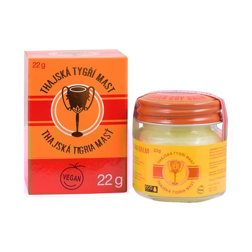 Thajská tygří mast GOLDEN CUP je vyrobena tradičními postupy pouze z přírodních surovin a její příznivý vliv na zdraví člověka jí zajistily světovou proslulost. Používá se při bolestech hlavy, svalových obtížích a stavech revmatizmu, bolestech kloubů, zad a nohou, poúrazových stavech, k aktivaci kožních buněk a k uvolnění napětí způsobené stresem a únavou. Nepoužívat pro děti do 3 let. Vhodné pro vegany. Balení ve skleněné dóze obsahuje 22 g.