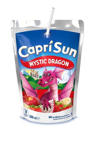 Capri-Sun Mystic Dragon is a refreshing fruit drink with an exotic dragon fruit flavor. Each pack contains 10 convenient 200ml pouches, totaling 2 liters. Thanks to its thermo foil, the drink stays cool longer. This popular beverage from the Czech Republic is perfect for kids and adults on the go or as a snack.