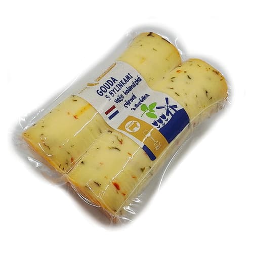 Enjoy this traditional Dutch Gouda with herbs from Rohlík BEZ KOMPROMISU. This creamy cow's milk cheese has a distinctive green interior, subtle nutty notes, and a rich herbal flavor. Aged for at least 4 weeks, it's perfect on its own or as part of a cheese platter. This 120g pack stays fresh for 13 days.