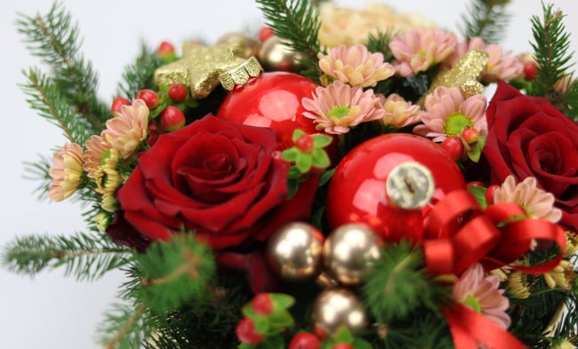 Krásná vánoční kombinace květů naaranžovaná v luxusním zlatém dárkovém boxu.