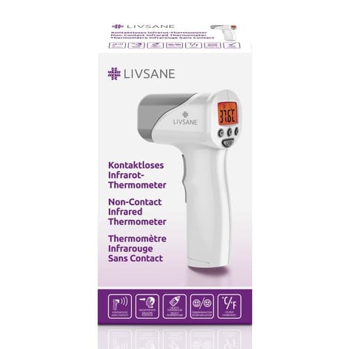 Zdravotnický prostředek. LIVSANE Teploměr bezkontaktní infračervený. Technické parametry: - Bezkontaktní multifunkční řešení. - Režimy měření teploty čela a předmětů. - Rychlé měření během 1 sekundy, doplněné akustickým signálem. - Vysoce kvalitní infračervený senzor. - Hygienický, snadno se čistí. - Velký a přehledný podsvícený displej s barevnou indikací horečky. - Automatické vypnutí. - Baterie jsou součástí balení. - Zdravotnický prostředek. - Záruka 2 roky.