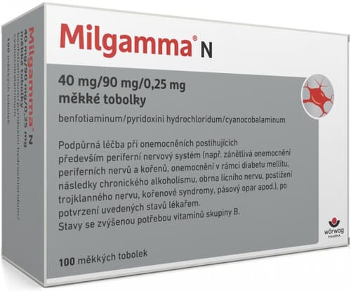 Přípravek Milgamma N obsahuje kombinaci vitamínů skupiny B (B1 ve formě benfotiaminu, B6 a B12). Vitamíny skupiny B obsažené v přípravku jsou nezbytné pro metabolismus nervových buněk. Milgamma N se používá jako podpůrná léčba při onemocněních postihujících především periferní nervový systém (např. zánětlivá onemocnění periferních nervů a kořenů, onemocnění v rámci diabetes mellitus, následky chronického alkoholismu, obrna lícního nervu, postižení trojklanného nervu, kořenové syndromy, pásový opar apod.). Dále se používá u stavů se zvýšenou potřebou vitamínů skupiny B. Balení obsahuje 100 tobolek.