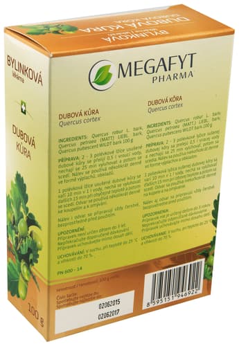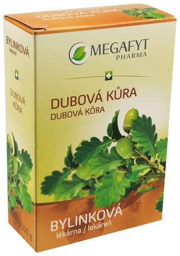 Megafyt Dubová kůra zevně při léčbě hemoroidů, ekzémů a při nadměrném pocení nohou. Nepřekračujte doporučené dávkování. Přípravek uchovávejte mimo dosah dětí. Balení obsahuje 100 g usušené dubové kůry.