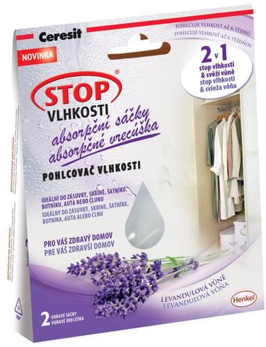 Absorpční sáčky do domácnosti s vůní levandule. Jsou ideální na velmi malé, uzavřené prostory s rozlohou 1–2 m² se špatnou cirkulací vzduchu. Absorpční sáček je složen z ultra absorpčních krystalků, zachytává a fixuje nežádoucí vlhkost ve vzduchu a přeměňuje ji na gel.