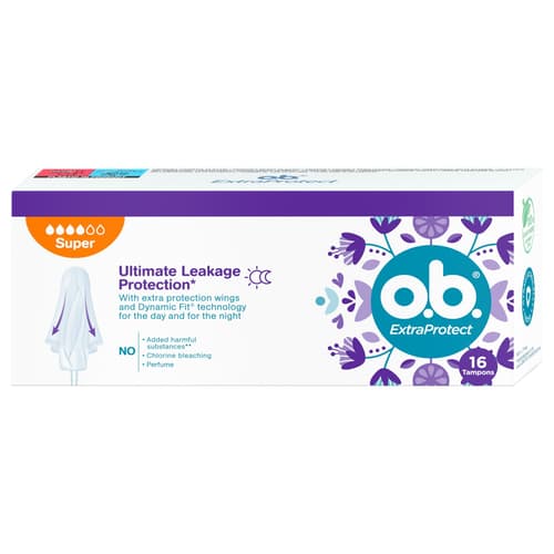 Tampony o.b.® ExtraProtect byly vyvinuty pro dny silnějšího krvácení a jsou obzvláště vhodné, když už běžný tampon nestačí. o.b.® ExtraProtect Super jsou doporučeny pro silnou menstruaci.