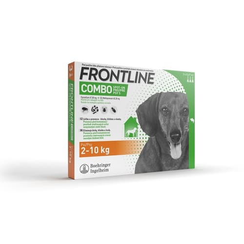 Veterinární přípravek. Frontline Combo Spot On Dog umožňuje bojovat proti parazitům psů. Je účinný proti: - Blechám, zabíjí dospělé blechy během 24 hodin po napadení vašeho zvířete. Působí 8 týdnů po aplikaci. - Vajíčkům a larvám blech (díky svému složení obohacenému o IGR), IGR (Insect Growth Regulator) je regulátor růstu hmyzu, který snižuje produkci vajíček, omezuje líhnutí larev a brání tvorbě kukel. Působí 8 týdnů po aplikaci. - Klíšťatům, eliminuje více než 90% klíšťat během 48 hodin po přichycení na zvířeti a tím snižuje riziko přenosu onemocnění. Toto riziko je největší 48 hodin po přichycení klíštěte na zvířeti. Působí 4 týdny po aplikaci. - Všenkám u psů a koček, usmrtí všenky na zvířeti nejpozději do 48 hodin. Balení obsahuje 3x pipetu 0,67 ml pro psy o hmotnosti 2 - 10 kg.