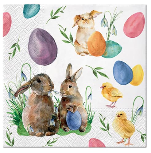 Velikonoční ubrousky s motivem zajíčků. Díky třem vrstvám papíru jsou pevné a savé, což je činí vhodnými nejen jako dekoraci, ale i pro každodenní použití.