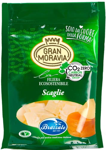 Sýrové hobliny Gran Moravia. Jedná se o dlouhozrající extra tvrdý sýr typu parmazán.