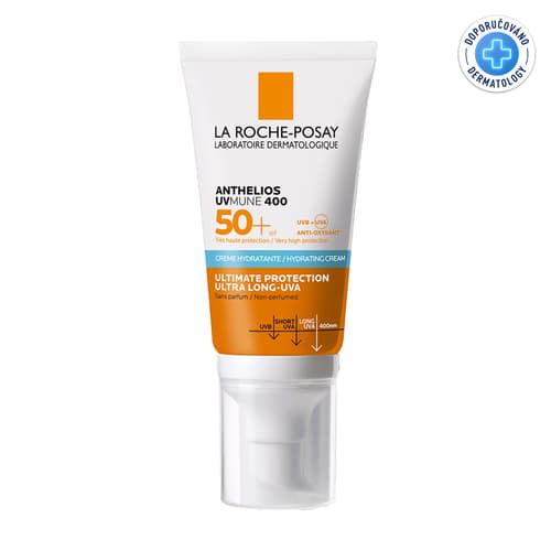 LA ROCHE-POSAY ANTHELIOS UVMUNE 400 hydratační krém SPF50 má velmi vysokou ochranu s antioxidačním efektem. Ultimátní ochrana s filtrem proti ultradlouhovlnnému UVA záření. Pomáhá předcházet oxidativnímu stresu vzniklému i v důsledku infračerveného záření A a znečištění. Nezanechává bílé stopy na kůži. Neobsahuje parfemaci. Hydratace až na 24 hodin. Testováno pod dermatologickou kontrolou na citlivé a reaktivní pleti. Testováno také pod oftalmologickou kontrolou na citlivých očích a citlivém očním okolí. Testováno na uživatelích nosících kontaktní čočky. Pro citlivou a reaktivní pleť. Vhodné i pro pokožku se sklony ke sluneční alergii. Pro všechny typy pleti. Balení obsahuje 50 ml.