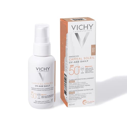 VICHY UV-AGE Daily Tónovaný Fluid bránící fotostárnutí SPF50 poskytuje pokročilou UVA a UVB ochranu pro korekci známek fotostárnutí pleti, tedy zabránění vzniku vrásek a tmavých skvrn. Jeho složení je obohacené o multipatentovanou technologii Netlock a anti-ageingové aktivní látky. Poskytuje lehké krytí pro sjednocení a rozjasnění tónu pleti. Ultrafluidní textura na bázi vody vytváří efektivní UV ochranný film, která je velmi odolná a nezanechává bílé stopy. Testováno pod oftalmologickou kontrolou. Hypoalergenní. Vhodné pro všechny typy pleti. Balení obsahuje 40 ml.