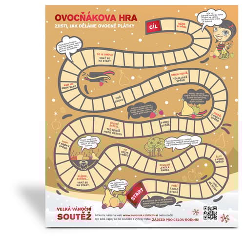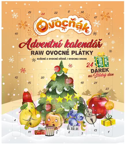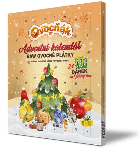 Adventní kalendář se všemi osmi příchutěmi ovocných plátků, které Ovocňák nabízí. Kalendář je vyroben pouze z papíru, a díky novému uspořádání je v něm místo i na dárek v podobě hračky.