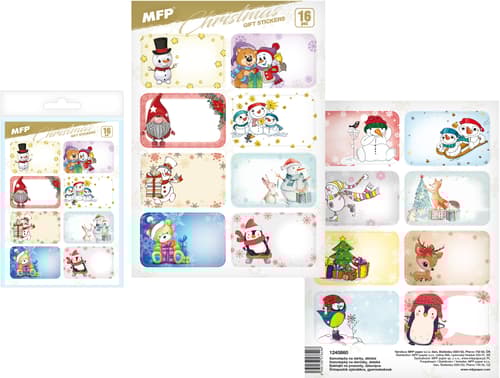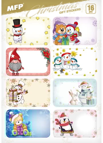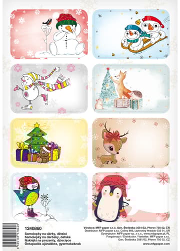 Dětské samolepkové jmenovky na dárky s různými vánočními motivy.
