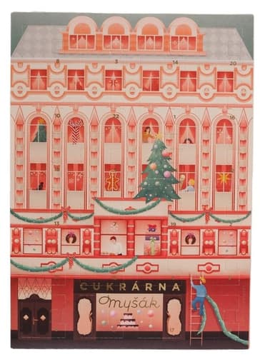 Adventní kalendář s 3 druhy luxusního nugátu z prémiové čokolády Valrhona. Kalendář ilustrovala Yveta Kroupová. Zobrazuje průčelí domu, ve kterém Cukrárnu Myšák najdete.Oslaďte si čekání na Ježíška.