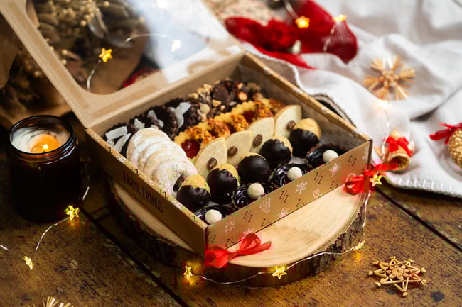 Guaranteed minimum durability from the time of delivery: 6 days.If the minimum durability is lower, please contact us and ask for a refund. Not applicable to items from the Save the Food section.Ořechové pracny 20,5 % [PŠENIČNÁ mouka, MÁSLO, cukr, VLAŠSKÉ OŘECHY 14,5 %, džem rybízový (červený rybíz, cukr, citronová šťáva, želírující látka: pektin), VEJCE, třtinový rum (třtinový destilát, voda, cukr, barvivo: karamel), jedlá sůl], Marcipánové košíčky 17 % [PŠENIČNÁ mouka, MÁSLO, kokos, cukr, marcipán 16,5 % (MANDLE 60 %, cukr, voda), VEJCE, SMETANA, hořká čokoláda (kakaová hmota, cukr, kakaový prášek se sníženým obsahem tuku, emulgátor: SÓJOVÝ lecitin, přírodní vanilkové aroma), kakaový prášek], Linecké 14,5 % [PŠENIČNÁ mouka, MÁSLO, cukr, VAJEČNÝ žloutek, džem rybízový (červený rybíz, cukr, citronová šťáva, želírující látka: pektin), čokoláda bílá (cukr, kakaové máslo 20 %, sušené MLɬKO, emulgátor: SÓJOVÝ lecitin, přírodní vanilkový extrakt), citronová šťáva, lyofilizované maliny, PISTÁCIE, citronové aroma, jedlá sůl], Čokoládové knoflíky 13,5 % [PŠENIČNÁ mouka, MÁSLO, cukr, VEJCE, hořká čokoláda 30 % (kakaová hmota, cukr, kakaový prášek se sníženým obsahem tuku, emulgátor: SÓJOVÝ lecitin, přírodní vanilkové aroma), SMETANA, LÍSKOVÉ OŘECHY, kakaový prášek, vanilkový cukr (cukr, vanilka), třtinový rum (třtinový destilát, voda, cukr, barvivo: karamel), jedlá sůl], Kokosové vlastěnky 13 % [PŠENIČNÁ mouka, MÁSLO, cukr, VEJCE, MLÉKO, strouhaný kokos 11 %, kakaový prášek, vanilkový cukr (cukr, vanilka 4 %), piškoty (PŠENIČNÁ mouka, VEJCE, cukr), třtinový rum (třtinový destilát, voda, cukr, barvivo: karamel), jedlá sůl], Vanilkové rohlíčky 12 % [PŠENIČNÁ mouka, MÁSLO, VLAŠSKÉ OŘECHY, cukr, VEJCE, vanilkový cukr (cukr, vanilka 4 %), jedlá sůl], Kávenky 9,5 % [PŠENIČNÁ mouka, MÁSLO, cukr, VEJCE, hořká čokoláda (cukr, kakaová hmota, kakaové máslo, kávová zrna, emulgátor: SÓJOVÝ lecitin, přírodní vanilkový extrakt), vanilkový cukr (cukr, vanilka 4 %), mletá káva 1 %, jedlá sůl].