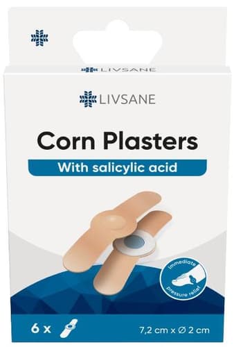 Livsane corn plasters are a medical device designed to help remove corns and provide immediate pain relief from pressure. They are soft, offering both protective and softening functions, and contain salicylic acid. Hypoallergenic and dermatologically tested, each pack includes 6 individually wrapped plasters.