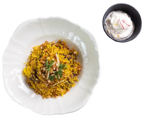 Hovězí Biryani s ananasovou raitou od Mahavira Kanswala