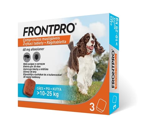 Veterinární přípravek. Chuťově atraktivní a žvýkací tableta pro psy s hovězím aroma proti blechám a klíšťatům. Je určená pro psy o hmotnosti 10-25 kg k léčbě napadení blechami u psů po dobu nejméně 5 týdnů a léčbě napadení klíšťaty u psů po dobu 4 týdnů. Pro optimální kontrolu napadení blechami a klíšťaty by měl být přípravek podáván v měsíčních intervalech během období výskytu blech a klíšťat. Blechy a klíšťata se musí připojit k hostiteli a zahájit sání krve, aby mohly být vystaveny léčivé látce. Výhody: Tablety jsou žvýkací a chuťově atraktivní pro většinu psů. Léčí napadení blechami po dobu nejméně 5 týdnů. Léčí napadení klíšťaty po dobu 4 týdnů. Podání opakovat v měsíčních intervalech (1 balení tak vystačí na 3 měsíce). Pro psy od hmotnosti 10 kg. Lze podávat tablety přímo nebo s krmivem. Balení obsahuje 3 žvýkací tablety.