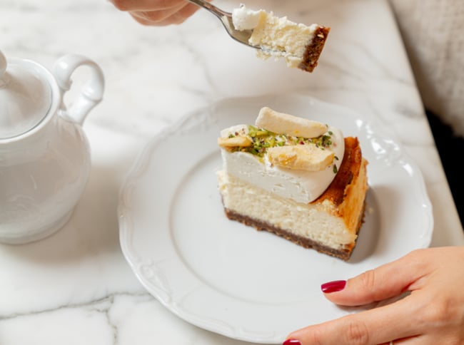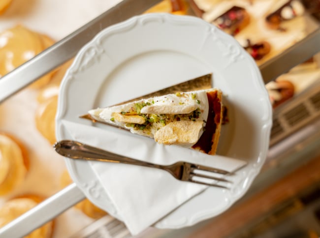 Sušenkový korpus s karamelovým sladem a skořicí, cream cheese s vanilkou, krém s bílou čokoládou, pistácie, sušené mango, to je narozeninový cheesecake z cukrárny Myšák. Hodí se jak na rodinnou oslavu, tak jako sladká tečka polední pauzy. Zkrátka k zulíbání.