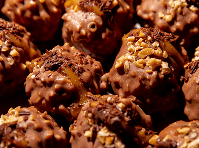 Sladké pražské koule z vyhlášené cukrárny Myšák. Nadýchaný piškot, hebký čokoládovo-karamelový krém a k tomu spousta křupavých arašídů zalitých mléčnou čokoládou.