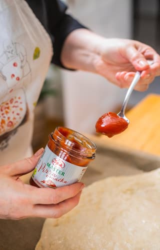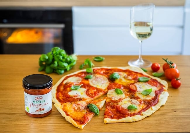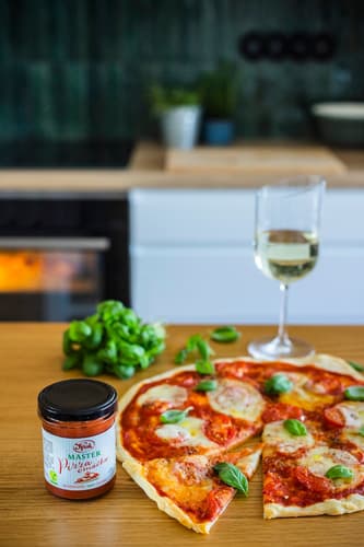 Vyladěná omáčka na pizzu s výraznou chutí bazalky a česneku. Bez konzervantů a bez lepku. Na 100 g omáčky bylo použito 195 g rajčat zrajících na jižním slunci.