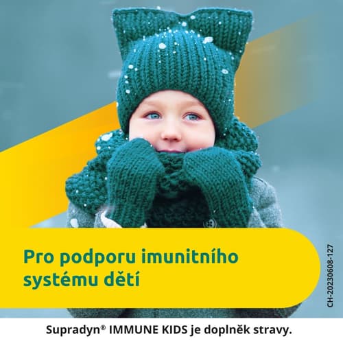 Doplněk stravy. Supradyn® Immune Kids je doplněk stravy obsahující vitamin C, D a zinek. Chutné želé s příchutí pomeranče, jahody a papáji s obsahem vitamínu C, vitamínu D a zinku. Toto složení totiž představuje trojnásobnou podporu pro normální funkci imunitního systému. Vitaminy C , D a zinek přispívají ke správné funkci imunitního systému. Silná trojka, když to venku fouká. Podpora imunity. Chutné želé gummies se 3 příchutěmi - pomerančovou, jahodovou a papajovou příchutí. Nepřekračujte doporučené denní dávkování. Uchovávejte mimo dosah dětí. Doplňky stravy nejsou náhradou pestré a vyvážené stravy. Balení obsahuje 100 ks želé gummies.