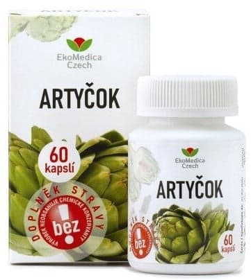 Doplněk stravy. EkoMedica Artyčok ve formě kapslí obsahující výtažek z artyčoku. Artyčok je rostlina původem ze Středomoří, svým vzhledem připomíná bodlák. Obsahuje pro organismus prospěšné látky, je zdrojem antioxidantů, vitaminů a minerálů (mangan, draslík, sodík), vlákniny. Artyčok napomáhá trávení, přispívá k udržování normálního stavu a funkce jater, podporuje detoxikaci organismu. Je vhodným podpůrným prostředkem při snižování tělesné hmotnosti, pomáhá udržovat normální hladinu krevních tuků. Bez chemických konzervantů. Nepřekračujte doporučené denní dávkování. Uchovávejte mimo dosah dětí. Doplňky stravy nejsou náhradou pestré a vyvážené stravy. Balení obsahuje 60 kapslí. Hmotnost obsahu 24 g.