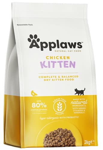 Applaws Kitten je první kompletní krmivo pro koťata s 80% obsahem bílkovin z kuřete, žádné vedlejší živočišné produkty. Granule jsou vhodné pro koťata, ale i pro březí a kojící kočky. Neobsahují obiloviny ani lepek, jsou přirozeně hypoalergenní, přírodně konzervovány vitamínem E a výtažkem z rozmarýnu.
