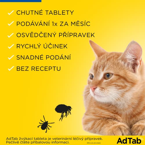 Dávkování: Pro zajištění správného dávkování nejprve co nejpřesněji určete hmotnost vaší kočky. AdTab podávejte s krmivem nebo 30 minut po krmení, aby byla zajištěna jeho maximální účinnost. Pro dosažení optimální kontroly před napadením blechami a klíšťaty podávejte přípravek AdTab jednou měsíčně. U koček s více než 8 kg živé hmotnosti použijte vhodnou kombinaci tablet, abyste dosáhli doporučené dávky 6 – 24 mg/ kg živé hmotnosti.