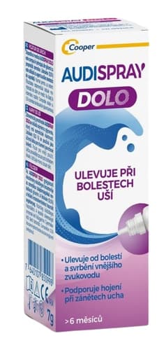 Zdravotnický prostředek. Audispray Dolo ušní kapky zmírňuje bolest a svrbění ve vnějším zvukovodu. Podporuje hojení při zánětech ucha. Je vhodný již od 6 měsíců věku. Účinek je založený na osmotických vlastnostech glycerolu v kombinaci s lidokainem, látkou způsobující povrchové znecitlivění. Audispray Dolo má podpůrný účinek při: 1. Zánětlivých stavech s projevy otoku, bolesti a svrbění ve vnějším zvukovodu. 2. Nepříjemných pocitech doprovázených bolestí způsobených pravidelným vystavováním se vodě a vlhkosti, například při plavání v bazénu. 3. Nepříjemných pocitech doprovázených bolestí způsobených dlouhodobým nošením sluchátek nebo nahromaděným ušním mazem, vytvářejícím mazové zátky ve vnějším zvukovodu. 4. Nepříjemných pocitech doprovázených bolestí způsobených pravidelným používáním čistících kosmetických přípravků, které ničí přirozenou vrstvu chránící vnější zvukovod, jako například šamponů, mýdel a gelů. Balení obsahuje 7 g.